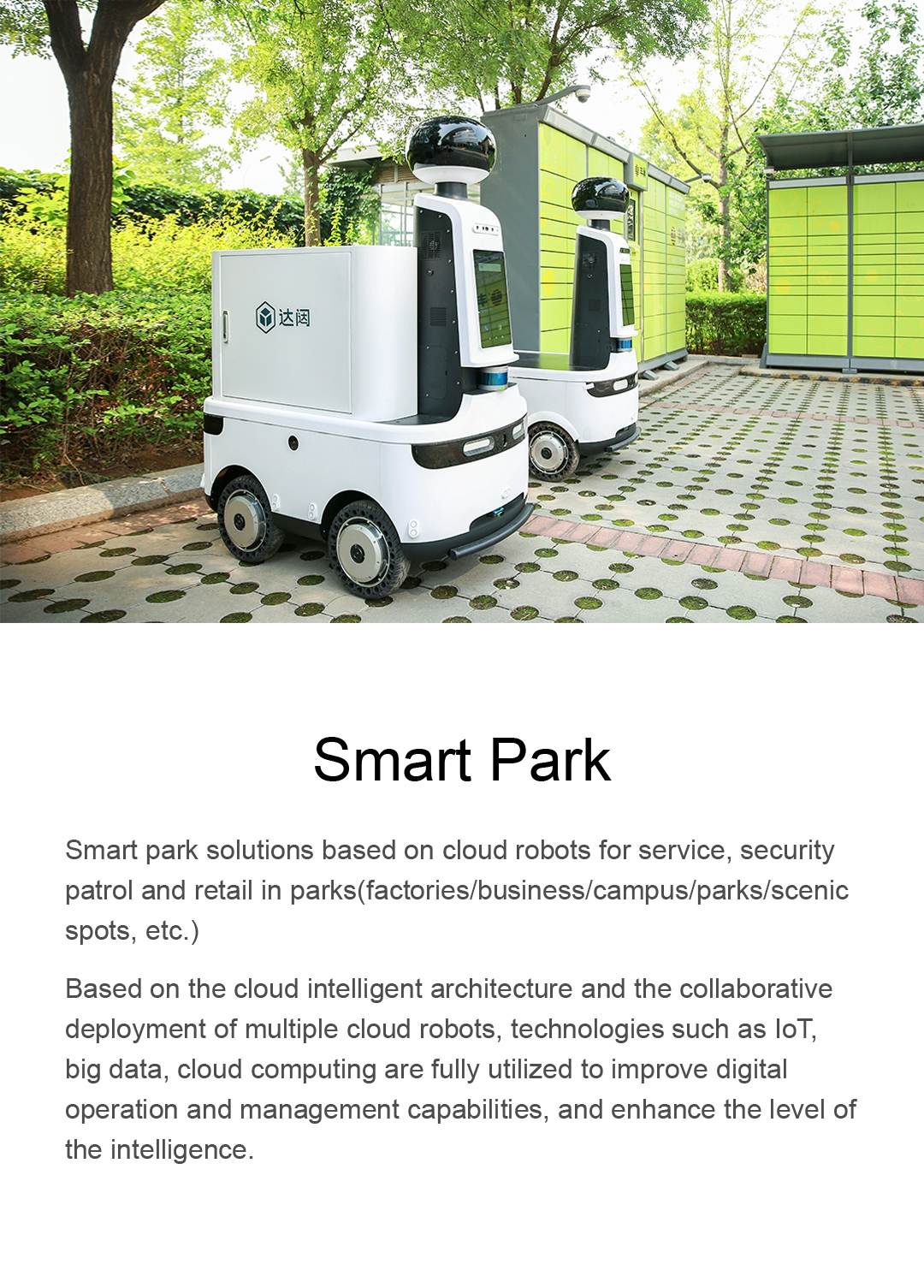 Smart park solutions based on cloud robots for service, security patrol and retail in parks